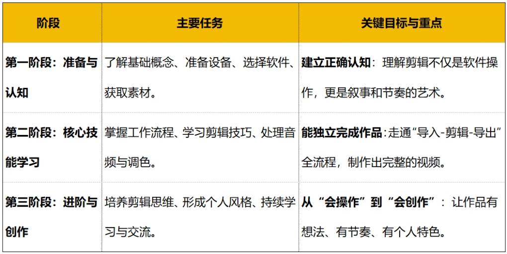 我们将剪辑学习分为三个阶段,作为一份完整的学习路径图。