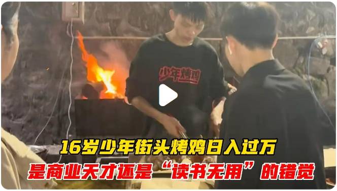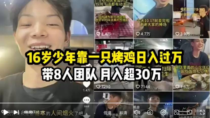 深圳16岁的烤鸡少年小陈最近火了。因为一位博主的探店视频,他的烤鸡摊意外走红网络,日营业额突破万元,每月收入近二十万元,从一个靠两亩薄田生活的农村家庭孩子,成长为月入数万的创业者。