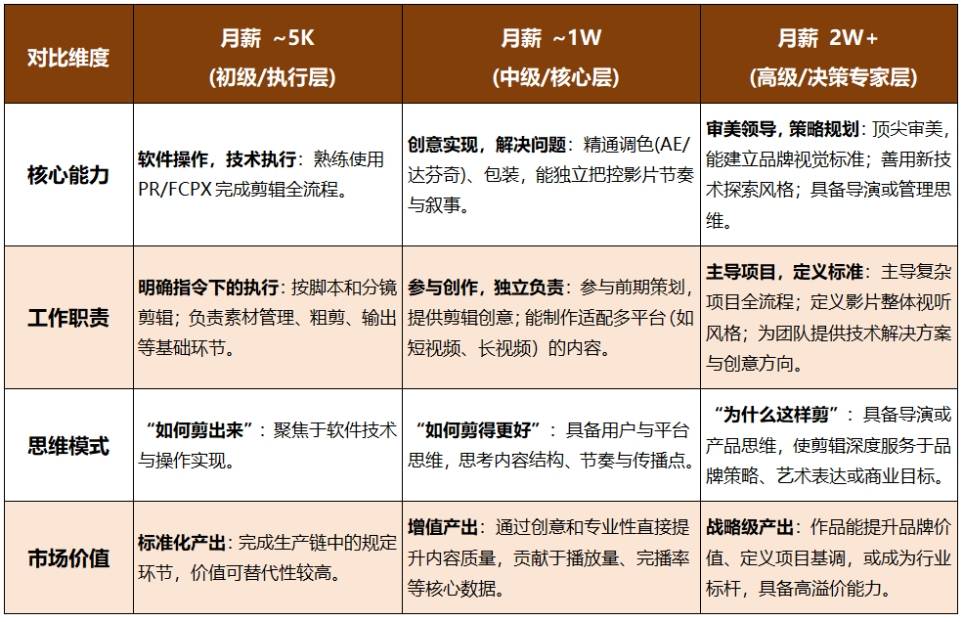 简单来说,5K、1W、2W月薪的剪辑师,分别代表了执行层、核心层和决策/专家层。他们的区别可以浓缩为下表: