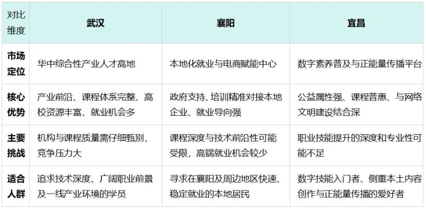 与武汉的全能型路线不同,襄阳和宜昌正走出一条依托地方产业、服务本地民生、富有公益色彩的特色化培训道路。它们的“突围”,不在于规模上抗衡,而在于定位上互补。