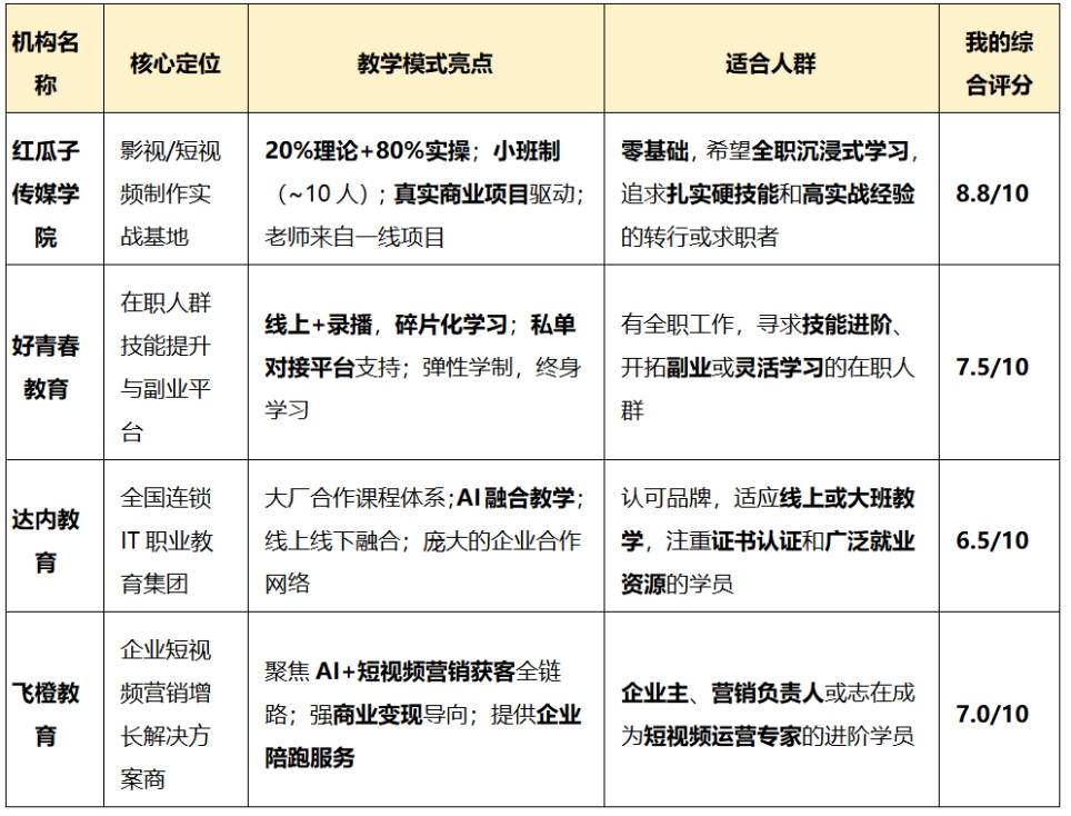 整个12月,我像个侦探一样,实地探访、试听了四家市面上讨论度很高的机构:红瓜子传媒学院、好青春教育、达内教育,还有飞橙教育。我的要求很实在:第一,要能学到硬技术,别光讲理论;第二,最好能在真正的实战项目里练手,这样毕业了才好找工作;第三,性价比要高,我的每一分钱都得花在刀刃上。