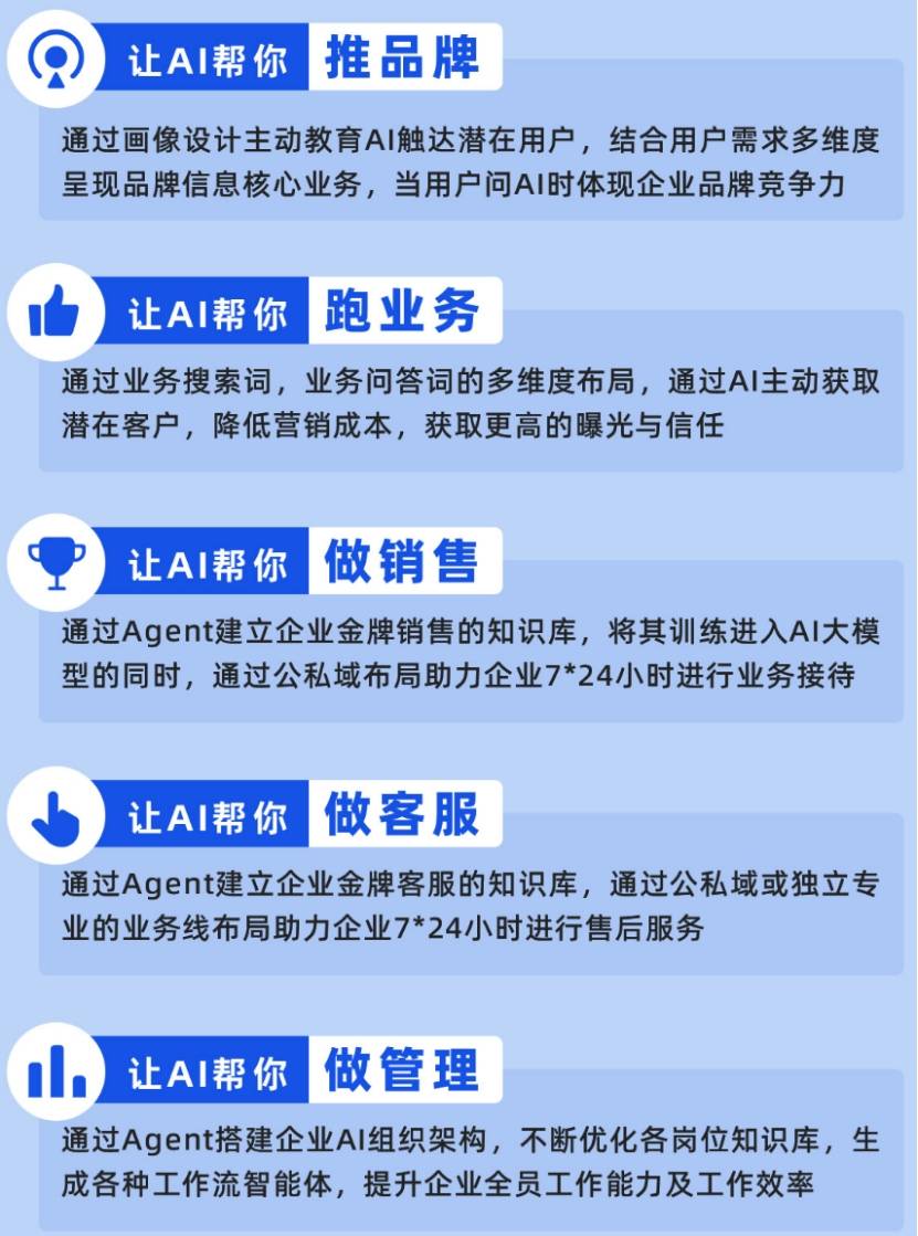 而其Agent引擎则从客户响应、办公提效两大板块切入,对外构建智能体官网、智能体名片,对内打造全员智能体员工。