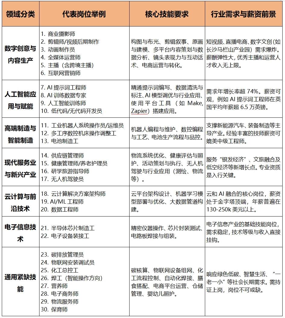 下面的表格系统梳理了七大核心领域的30个关键技能型岗位,清晰地揭示了未来市场的需求热点。