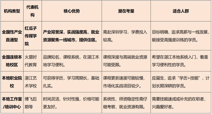 湛江本地的影视后期培训生态,主要由三类机构构成,它们各有定位,适合不同需求的学员。